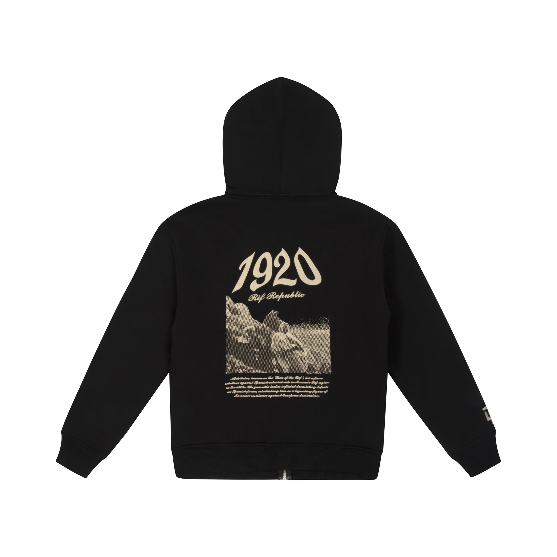\nCrafted from premium materials, this black zip hoodie combines modern streetwear with historical depth. The front remains minimalistic for versatility, while the detailed back print tells a story of determination and pride. Finished with the signature Le Rif label, this piece is perfect for making a statement while staying comfortable and stylish.