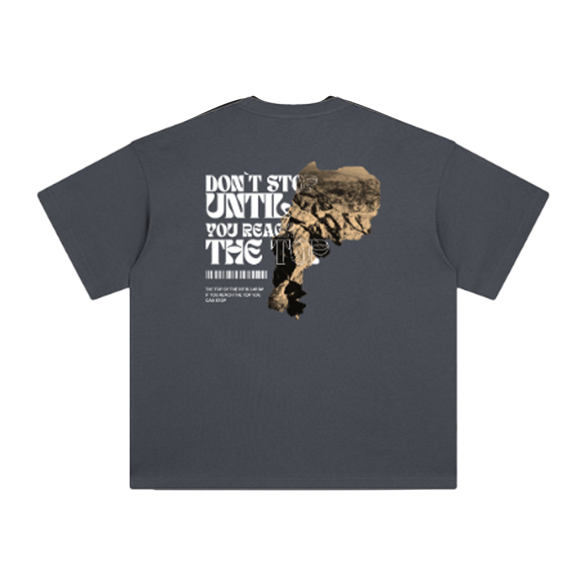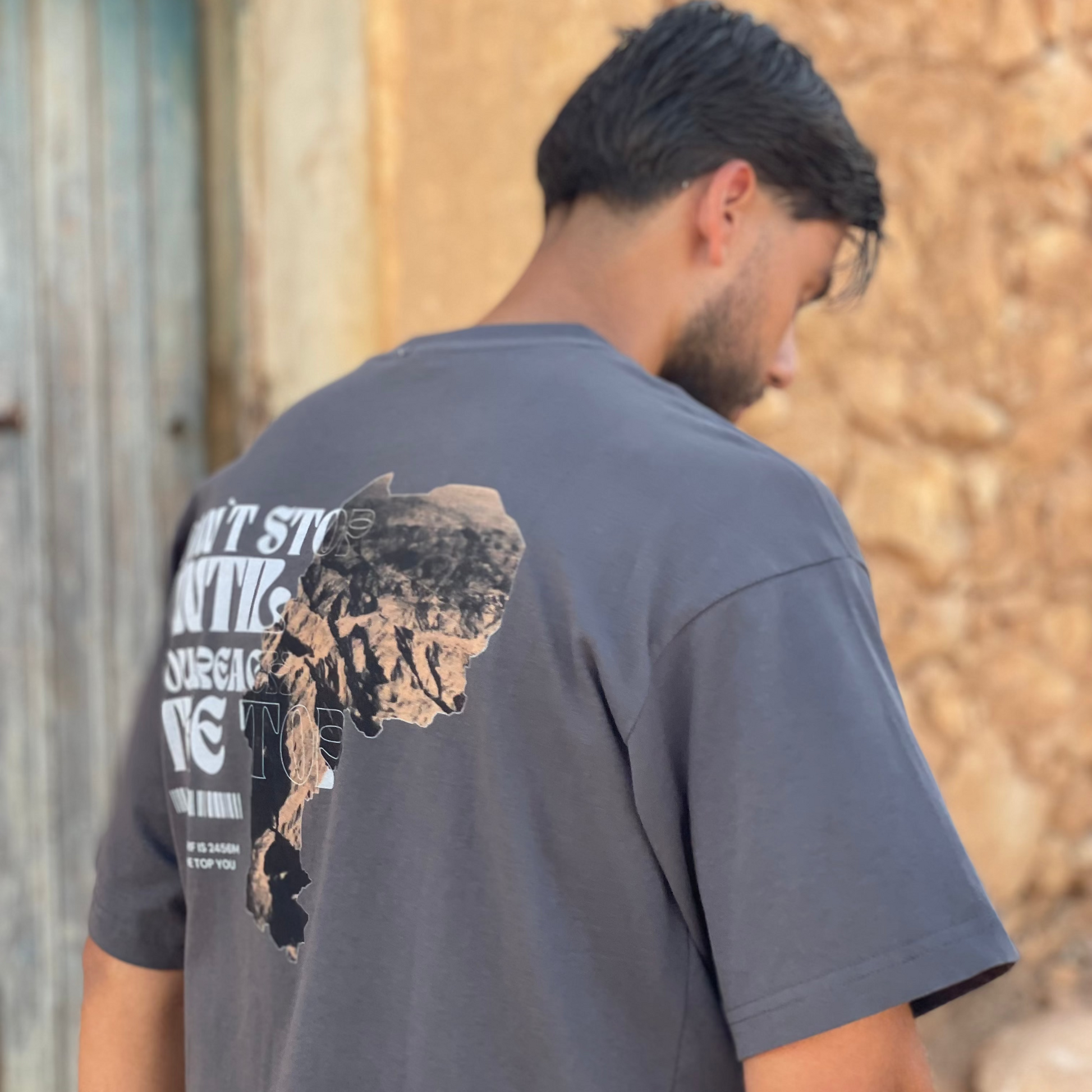 The DONT STOP UNTIL YOU REACH THE TOP OVERSIZED SHIRT GREY embodies determination with an image of the majestic Rif Mountains. This image is in the shape of Morocco. This shirt is made of high-quality cotton with an oversized fit, it combines comfort with inspiration in style. A reminder to never give up, even when the road is steep uphill. This is available in gray and black.